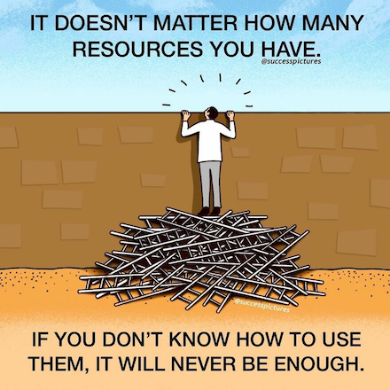 The comic strip shows four brick walls side by side, labelled A, B, C and D. The first and second brick wall have a cat on top of them. The third and fourth have a cat sat on the floor. The first wall has a large pile of poorly placed ladders that the cat used to climb up. A caption reads: sufficient resources, used inefficiently. The second wall has a well-placed ladder. The caption reads: sufficient resources, used efficiently. The third wall has a small, single ladder, laid flat on the floor. The caption reads: insufficient resources, used inefficiently. The final wall has a small, single ladder, placed against the wall, but the ladder is too short to reach the top. The caption reads: insufficient resources, used efficiently.